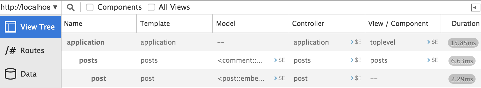 You can use the View Tree to inspect your application's current state. The View Tree shows you the currently rendered templates, models, controllers, and components, in a tree format. Click on the View Tree menu on the left to see these.